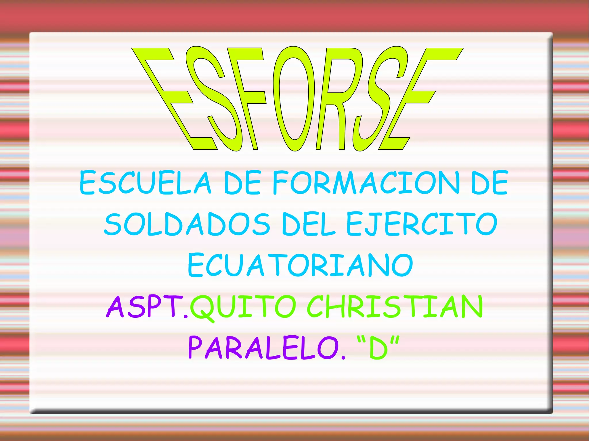 La Escuela de Formación de Soldados del Ejército Ecuatoriano tiene la misión de formar soldados, especialistas y servicios del ejército en campos militares, humanísticos y tecnológicos basados en competencias profesionales y valores como el respeto a los derechos humanos. Su visión es convertirse en un instituto de formación académico-militar superior, de excelencia y liderazgo en la región, integrado por personal altamente calificado para fortalecer la gestión del ejército y las fuerzas arm