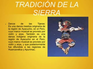 El documento describe las tradiciones de las tres regiones del Perú: la Costa, la Sierra y la Selva. En la Costa, una tradición es el carnaval, una fiesta mágica donde lo natural y sobrenatural se unen. En la Sierra, una danza tradicional es la Danza de las Tijeras de Ayacucho, acompañada por violín y arpa. El documento proporciona información sobre las costumbres y tradiciones de cada región del Perú.