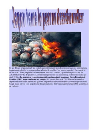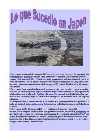 El terremoto y tsunami de Japón de 2011 fue un terremoto de magnitud 9.0 que generó olas de hasta 10 metros y causó más de 3 mil muertes. Fue el terremoto más potente registrado en Japón y el quinto más fuerte en el mundo. Además, provocó la erupción de un volcán y movió la Isla de Japón aproximadamente 2.4 metros.