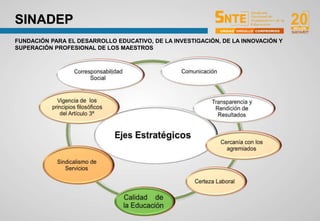 El documento presenta el Sistema Nacional de Desarrollo Profesional Docente (SINAPED) del SNTE, que propone una innovadora plataforma de formación y desarrollo profesional para docentes, adaptándose a sus contextos y niveles. Se enfatiza la creación de un modelo educativo propio que promueve la capacitación continua, la evaluación del desempeño docente y el desarrollo de comunidades de aprendizaje. Además, se busca implementar estrategias de innovación en la educación mediante alianzas, diseño curricular y cursos masivos en línea.