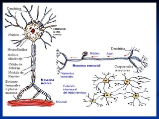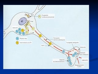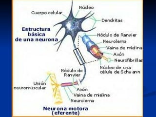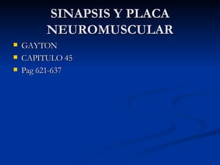 El documento describe el sistema nervioso motor y la sinapsis neuromuscular. Explica que la información se transmite a través de potenciales de acción en las neuronas y que en las sinapsis químicas, las terminales presinápticas liberan neurotransmisores que se unen a receptores postsinápticos y pueden excitar o inhibir la siguiente neurona. También describe los diferentes tipos de neurotransmisores y neuropéptidos involucrados en la transmisión sináptica.