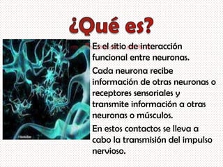 Las sinapsis son los sitios de comunicación entre neuronas donde una neurona transmite señales eléctricas o químicas a otra neurona u órgano efectuador. Permiten la formación de circuitos neuronales y son cruciales para procesos como la percepción y el pensamiento. Existen diferentes tipos de sinapsis dependiendo de las partes de las neuronas involucradas.