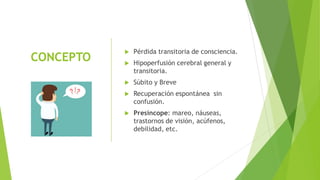 El documento aborda el síncope como una pérdida transitoria de conciencia, detalla su epidemiología, mecanismos causales y tipos clínicos, así como los factores de riesgo y diagnóstico diferenciales. Se evalúan diferentes enfoques de tratamiento dependiendo de la causa del síncope, desde medidas preventivas hasta intervenciones más complejas como marcapasos o cirugía. Se enfatiza la importancia de la evaluación inicial para estratificar el riesgo y determinar la necesidad de estudios subsecuentes.