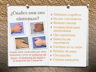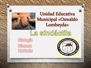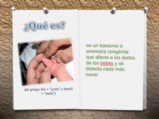La sindactilia es una condición en la que dos o más dedos están unidos por una membrana o completamente fusionados. Puede presentarse solo o como parte de otros síndromes. Se produce entre la sexta y octava semana del desarrollo fetal y afecta igual a hombres y mujeres. En la mayoría de los casos requiere cirugía para separar los dedos, aunque el tratamiento depende de la gravedad y ubicación de la sindactilia.