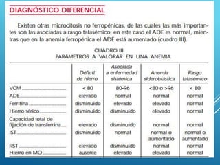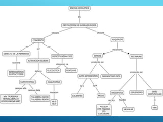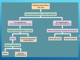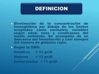 Este documento define y describe el síndrome anémico. Define la anemia como una disminución de la concentración de hemoglobina por debajo de los límites normales. Describe las causas de la anemia, incluida la deficiencia de hierro, folatos y vitamina B12, así como la hemólisis y la insuficiencia de la médula ósea. También clasifica las anemias y describe los síntomas, el diagnóstico y el tratamiento de diferentes tipos como la anemia ferropénica.