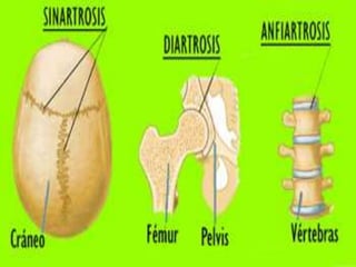 Este documento describe los tres tipos principales de articulaciones en el cuerpo: sinartrosis (inmóviles), anfiartrosis (semimóviles) y diartrosis (móviles). Las sinartrosis no tienen cavidad articular y están unidas por tejido fibroso o cartilaginoso, como entre las vértebras. Las anfiartrosis tienen una movilidad escasa y están unidas por cartílago, como la rodilla y el codo. Las diartrosis son las más móviles y contienen líquido sinovial, teniendo una estruct