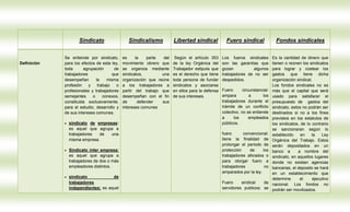 El documento define conceptos clave sobre sindicatos como su definición, tipos de sindicatos, libertad sindical y fuero sindical. Explica que un sindicato es una agrupación de trabajadores que desempeñan la misma profesión para defender sus intereses comunes. Detalla los pasos para formar un sindicato como presentar la solicitud con acta constitutiva, estatutos y lista de integrantes.