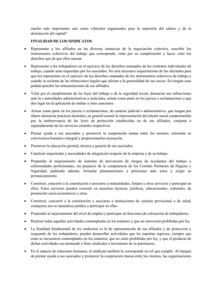 Los sindicatos en Venezuela tienen como objetivo principal representar y defender los intereses de los trabajadores. Se describen varios tipos de sindicatos como sindicatos de empresa, interempresa e independientes. Para constituir un sindicato legalmente, se requiere celebrar una asamblea con trabajadores y cumplir con ciertos quórums mínimos de membresía según el tamaño de la empresa.