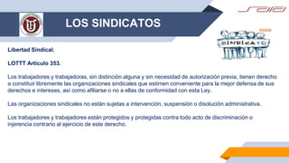 El documento habla sobre los sindicatos en Venezuela según la Ley Orgánica del Trabajo, los Trabajadores y las Trabajadoras (LOTTT). Describe los principios de libertad y autonomía sindical, y prohíbe prácticas antisindicales. Explica que los sindicatos deben registrarse a nivel nacional o regional/estatal, y los requisitos mínimos de afiliados para constituir diferentes tipos de sindicatos. También detalla los documentos requeridos para el registro, incluyendo el acta constitutiva, estat