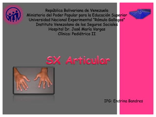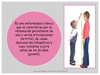 La artritis idiopática juvenil es una enfermedad crónica que causa inflamación en las articulaciones en niños menores de 16 años, cuya causa es desconocida. Se cree que el sistema inmune ataca erróneamente a las células de las articulaciones, causando inflamación. Puede haber factores genéticos y ambientales que contribuyan a su aparición. Los síntomas incluyen dolor, hinchazón y limitación de la movilidad de las articulaciones.