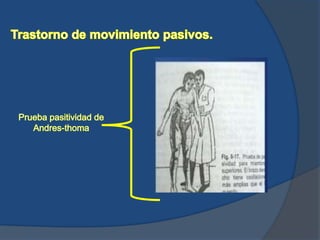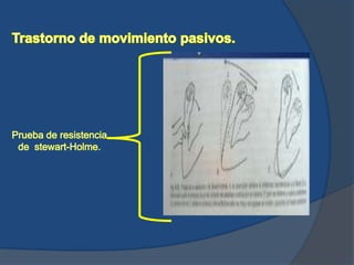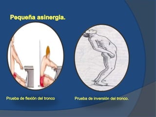 Este documento describe las vías nerviosas que involucran al cerebelo y los síntomas asociados con diferentes enfermedades cerebelosas. Enlista las rutas espinocerebelosas, el aparato vestibular, y las fibras procedentes de la corteza como las principales vías que involucran al cerebelo. También enumera varios tipos de enfermedades cerebelosas como tumores, hemorragias e inflamaciones que pueden causar síndromes cerebelosos puros o dominantes.