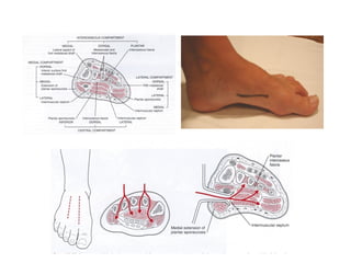Este documento describe el síndrome compartimental, incluyendo su definición, causas, síntomas clínicos, diagnóstico y tratamiento. El síndrome compartimental ocurre cuando la presión dentro de un espacio anatómico limitado aumenta y compromete la circulación de los tejidos dentro de ese espacio. Los principales síntomas son dolor, parestesias, presión, palidez, parálisis y ausencia de pulso. El tratamiento de elección es la fasciotomía quirúrgica para aliviar la presión