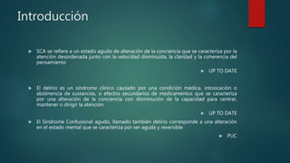 Este documento define el síndrome confusional agudo (SCA) o delirium y describe sus características clínicas, causas, diagnóstico y manejo. El SCA se caracteriza por una alteración aguda de la atención y la conciencia, causada comúnmente por infecciones. Su diagnóstico requiere evaluar los síntomas, buscar la enfermedad subyacente y descartar otros trastornos. El tratamiento se enfoca en tratar la causa y controlar los síntomas mediante medidas no farmacológicas y f
