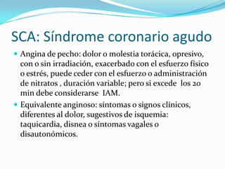 Este documento resume las definiciones, epidemiología, fisiopatología, etiología, evaluación, signos y síntomas, diagnóstico por pruebas paraclínicas como EKG y marcadores bioquímicos, y tratamiento del síndrome coronario agudo. Define las diferentes formas de presentación clínica como angina estable, inestable e infarto agudo del miocardio, y describe los factores de riesgo y las opciones terapéuticas como trombolíticos, angioplastia y medicamentos.