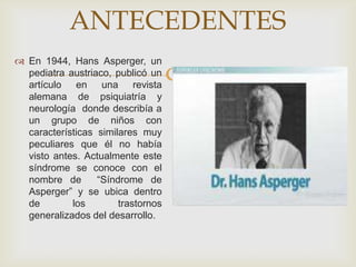 El documento describe el síndrome de Asperger. En 1944, el pediatra Hans Asperger describió un grupo de niños con características sociales peculiares. Actualmente se conoce como síndrome de Asperger y se caracteriza por dificultades en la interacción social y la comunicación, así como intereses restringidos y comportamientos estereotipados. No existe un tratamiento único, pero incluye entrenamiento en habilidades sociales, terapia del lenguaje y psicoterapia.