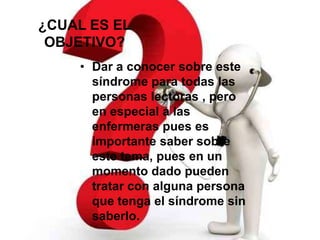 El documento proporciona información sobre el síndrome de Asperger. Explica que es un trastorno del desarrollo neurobiológico que afecta el funcionamiento social y los intereses de una persona. Sus causas pueden incluir anomalías cerebrales o factores genéticos. Las características incluyen dificultades en la interacción social, falta de flexibilidad mental y comportamientos e intereses restringidos. El tratamiento puede incluir terapia cognitiva, entrenamiento social y medicamentos para tratar síntomas como ansiedad o hiperactiv