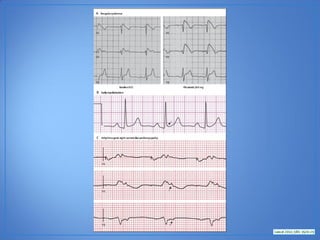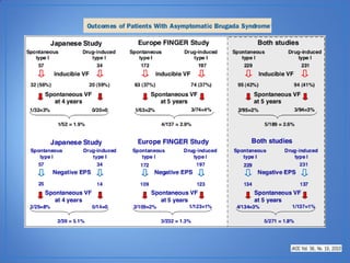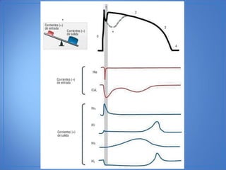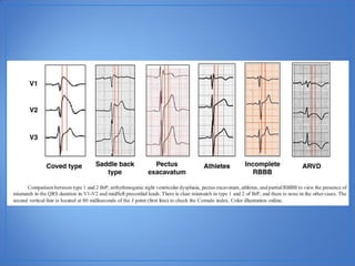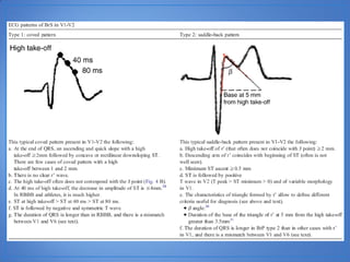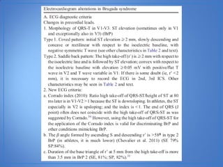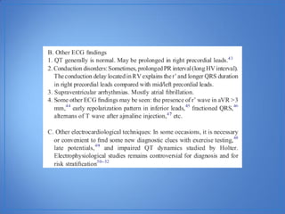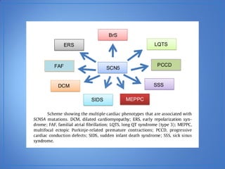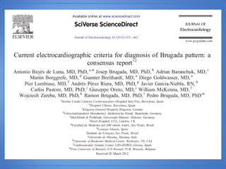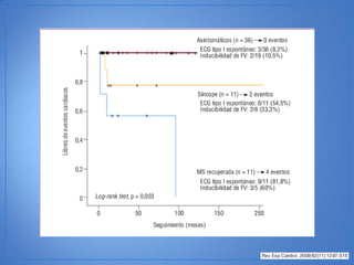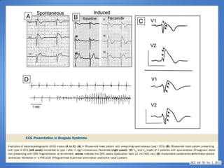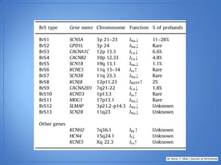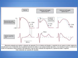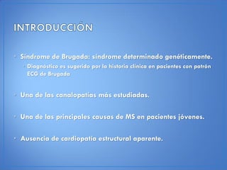 El documento resume las características del síndrome de Brugada, una canalopatía que causa arritmias ventriculares y muerte súbita. Se describe que es una enfermedad genética que se manifiesta con patrones ECG anormales y aumenta el riesgo de muerte súbita en pacientes jóvenes. El diagnóstico requiere la presencia de un patrón ECG tipo 1 junto con síntomas o factores de riesgo. El tratamiento incluye dispositivos cardioversores implantables para pacientes sint