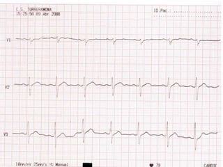 El documento describe el Síndrome de Brugada, una enfermedad arritmogénica hereditaria que puede causar arritmias ventriculares y muerte súbita. Se caracteriza por elevaciones en el segmento ST en el ECG y puede presentarse de forma asintomática o con síncopes. El diagnóstico se realiza mediante ECG y pruebas genéticas. El tratamiento incluye desfibrilador automático implantable para pacientes sintomáticos o con riesgo alto.