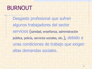 El burnout es un síndrome de desgaste profesional que sufren trabajadores de sectores como la sanidad y la educación debido a altas demandas y condiciones de trabajo estresantes. Se caracteriza por agotamiento emocional, despersonalización y baja productividad, así como síntomas físicos, emocionales y de comportamiento. Es más probable en personas sensibles, dedicadas al trabajo y con alta autoexigencia. Se previene mejorando el entorno laboral, fomentando el apoyo social y enseñando estrategias de afrontamiento individual