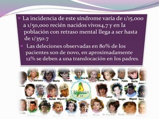 Este documento describe el síndrome de maullido de gato, una mutación genética causada por la pérdida parcial de un cromosoma. Los pacientes con este síndrome suelen tener bajo peso al nacer, crecimiento lento, llanto agudo, pequeño perímetro craneal, deficiencia mental e hipotonía.