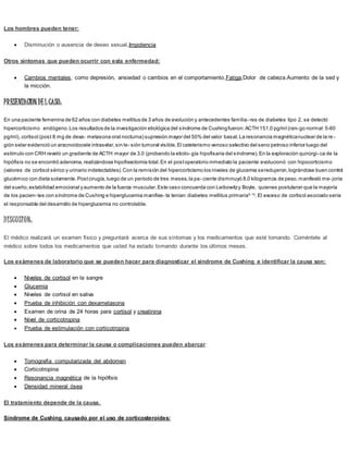 El síndrome de Cushing ocurre cuando el cuerpo tiene altos niveles de la hormona cortisol. La causa más común es el uso excesivo de medicamentos glucocorticoides, pero también puede deberse a tumores que causan una producción excesiva de cortisol. Los síntomas incluyen aumento de peso, cambios en la piel y huesos, y problemas de salud como diabetes e hipertensión. El tratamiento depende de la causa subyacente y puede incluir cirugía, medicamentos u hormonoterapia.