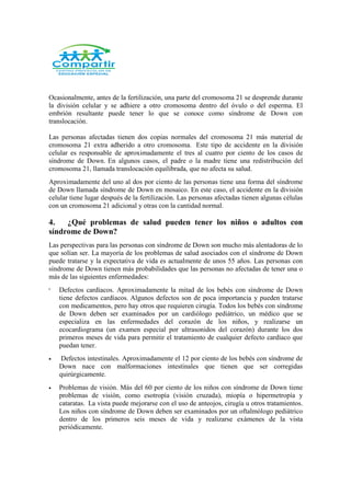 El documento proporciona información sobre el síndrome de Down, incluyendo su definición, causas, características físicas comunes, problemas de salud asociados y capacidades de las personas con esta condición. El síndrome de Down es un trastorno cromosómico causado por la presencia de material genético extra del cromosoma 21, lo que resulta en retraso mental y otros problemas que varían en gravedad. Con el tratamiento adecuado, la mayoría de las personas con síndrome de Down pueden llevar una vida pl