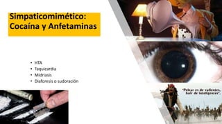 Este documento describe los síntomas de varios tipos de síndromes de intoxicación. El síndrome simpaticomimético, causado por cocaína y anfetaminas, causa hipertensión, taquicardia, midriasis y sudoración. El síndrome colinérgico, causado por organofosforados y carbamatos, causa bradicardia, depresión respiratoria, broncoconstricción y pupilas puntiformes. El síndrome anticolinérgico, causado por atropina y antihistamínicos, ca