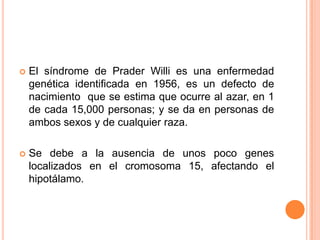 El síndrome de Prader-Willi es una enfermedad genética rara causada por la ausencia de genes en el cromosoma 15, que causa un apetito insaciable, retraso intelectual y problemas de desarrollo. No tiene cura y se trata sintomáticamente mediante control de peso, dieta, ejercicio y educación especial para controlar el comportamiento.