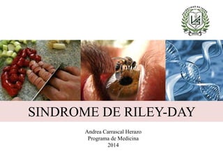 El síndrome de Riley-Day es una enfermedad genética rara causada por mutaciones en el gen IKBKAP que se hereda de forma autosómica recesiva. Provoca insensibilidad al dolor y otros síntomas como apnea, inestabilidad emocional y escoliosis. Se diagnostica mediante pruebas genéticas y el tratamiento se centra en controlar las complicaciones y síntomas.