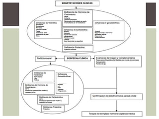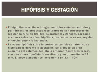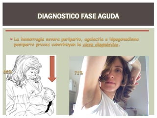 El documento describe el síndrome de Sheehan, el cual es un infarto de la glándula hipofisaria secundario a una hemorragia postparto que ocurre en mujeres. Esto causa un panhipopituitarismo con niveles bajos de hormonas de la hipófisis anterior, incluyendo hormona estimulante del tiroides, estimulante hormona adrenocorticotrópica y la estimulante de las hormonas sexuales. Los síntomas incluyen agalactia, amenorrea, falta de anabolismo proteico, hipotiroidismo