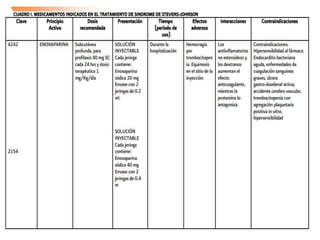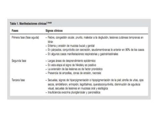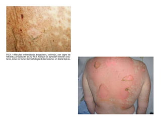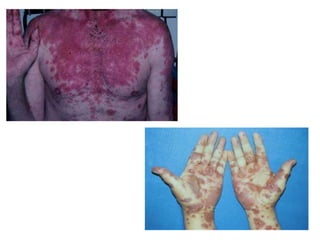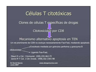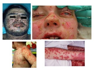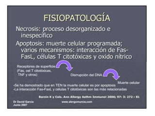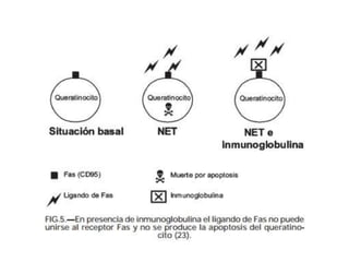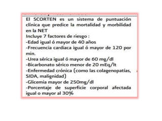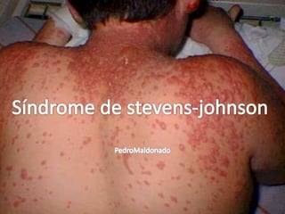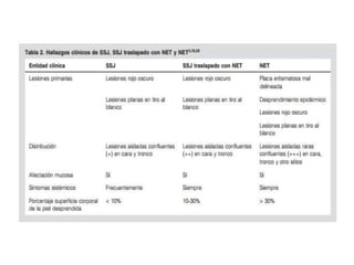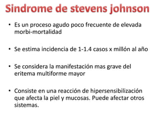 Este documento describe el síndrome de Stevens-Johnson y la necrólisis epidérmica tóxica (NET), dos enfermedades graves que afectan la piel y las mucosas. Se caracterizan por una reacción de hipersensibilidad que puede ser causada por medicamentos, infecciones virales o bacterianas, o factores idiopáticos. Los medicamentos son la causa más común, especialmente sulfonamidas, penicilinas y anticonvulsivantes. La suspensión rápida del agente causante es crucial para reducir la morbilidad