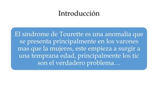 El síndrome de Tourette es un trastorno neurológico caracterizado por movimientos y sonidos repetitivos e involuntarios llamados tics. Se presenta principalmente en varones y comienza en la niñez. El neurólogo francés Georges Gilles de la Tourette describió por primera vez la condición en 1885. Los tics suelen desaparecer alrededor de los 20-24 años, pero algunas personas los mantienen de por vida. Las causas incluyen anormalidades en los neurotransmisores y circuitos cerebrales, y factores genéticos y