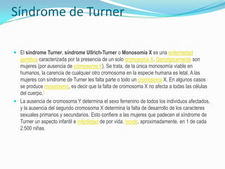 El síndrome de Turner es una enfermedad genética causada por la presencia de un solo cromosoma X. Fue descubierto por el endocrinólogo Henry Turner en 1938 y se caracteriza por la falta de desarrollo de los caracteres sexuales y la infertilidad. Las niñas con este síndrome suelen ser de baja estatura y reciben tratamiento con hormona de crecimiento. Además, se les administran estrógenos para promover el desarrollo sexual secundario.