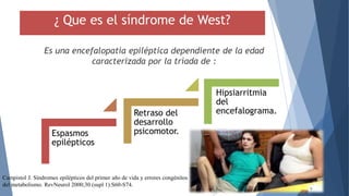 El síndrome de West es una encefalopatía epiléptica caracterizada por espasmos epilépticos, retraso del desarrollo psicomotor y hipsarritmia en el EEG. Su etiología puede ser sintomática, criptogénica o idiopática, representando la forma más común de epilepsia en el primer año de vida, con una incidencia de 2 a 5 por cada 10,000 nacidos vivos. Aunque el pronóstico es generalmente desfavorable, es mejor en casos idiopáticos, donde los niños pueden experimentar una desaparición de crisis y un desarrollo psicomotor normal.