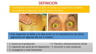 El documento define el síndrome icterico como la coloración amarilla de la piel, mucosas y conjuntivas oculares debido al depósito de bilirrubina. Explica que puede deberse a alteraciones en la producción, captación, conjugación, tránsito o excreción de bilirrubina. Describe las clasificaciones del síndrome icterico y los pasos para diagnosticar la causa, incluyendo anamnesis, exploración física, estudios de laboratorio como hemograma y pruebas hepáticas, ecografía abdominal y otras p