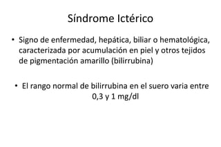 Este documento describe la ictericia y la cirrosis biliar primaria. La cirrosis biliar primaria es una enfermedad autoinmune que causa inflamación y destrucción de los conductos biliares hepáticos, lo que puede provocar ictericia, prurito y fatiga. El diagnóstico se basa en niveles anormales de enzimas hepáticas, la presencia de anticuerpos antimitocondriales y una biopsia hepática. El tratamiento incluye ácido ursodesoxicólico y en casos graves, un trasplan