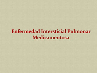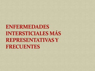 Este documento describe las enfermedades intersticiales pulmonares, un grupo de afecciones que afectan los tejidos pulmonares alveolointersticiales y vías respiratorias. Las principales causas son ambientales, sarcoidosis y fibrosis pulmonar idiopática. Presentan síntomas comunes como tos seca y disnea, aunque cada enfermedad tiene síntomas específicos. El diagnóstico se basa en el cuadro clínico, pruebas de función pulmonar restrictiva y hallazgos radiológicos intersticiales.