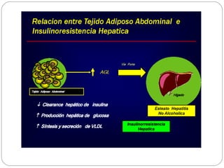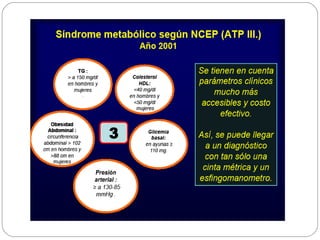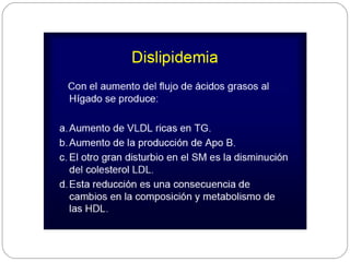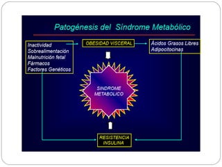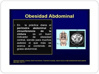 El documento aborda el síndrome metabólico y la obesidad, destacando la diferencia en la distribución de tejido adiposo entre hombres y mujeres, así como las implicaciones metabólicas de la adiposidad. Se discuten los mecanismos de regulación del peso y el impacto de factores genéticos y ambientales en la obesidad, asociada a riesgos como diabetes y enfermedades cardiovasculares. Además, se mencionan opciones de tratamiento médico y quirúrgico, así como la legislación reciente para abordar la obesidad y trastornos alimentarios.