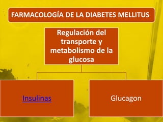 Este documento habla sobre la farmacología del tratamiento de la diabetes mellitus. Explica diferentes tipos de medicamentos como secretagogos de insulina de primera y segunda generación, agonistas del receptor GLP-1, inhibidores de la DPP-4, metformina, y más. También cubre medicamentos para el tratamiento de dislipidemias, sobrepeso y obesidad.