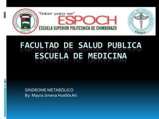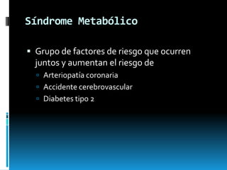 El síndrome metabólico es un conjunto de factores de riesgo que, al presentarse juntos, incrementan el riesgo de sufrir enfermedades como la arteriopatía coronaria y la diabetes tipo 2. Se caracteriza por obesidad visceral, resistencia a la insulina y otros trastornos metabólicos, con factores contribuyentes como la genética y la falta de ejercicio. El tratamiento incluye cambios en el estilo de vida y medicamentos para controlar la presión arterial, colesterol y azúcar en sangre, así como la pérdida de peso.