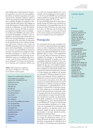 El documento resume las características clave del síndrome nefrítico. Explica que se caracteriza por la aparición súbita de hematuria, proteinuria, edemas, oliguria y alteración de la función renal, a menudo con hipertensión arterial. La glomerulonefritis aguda postestreptocócica es el prototipo del síndrome nefrítico en niños y ocurre tras una infección faringoamigdalar o cutánea por estreptococo, con curación clínica e histológica en la mayoría de los casos.