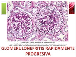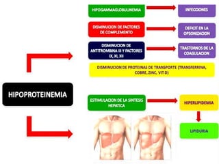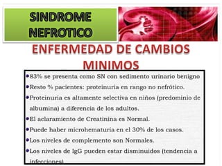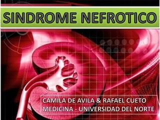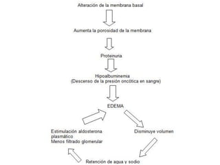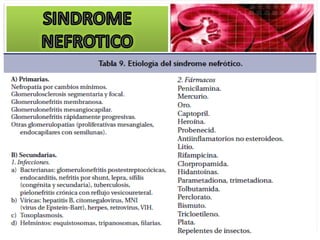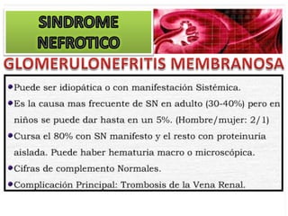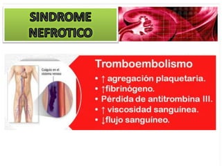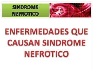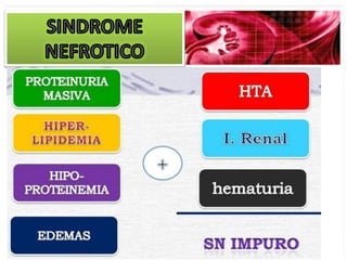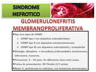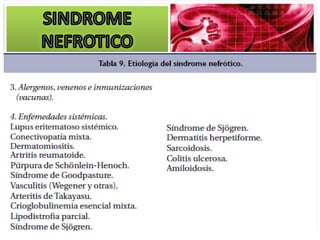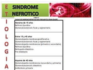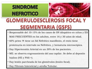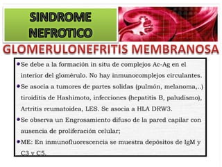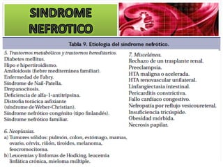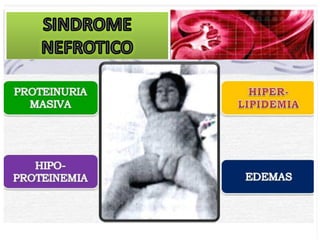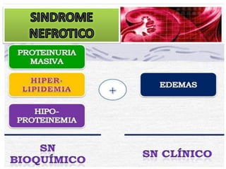 El documento describe las características clínicas y patológicas del síndrome nefrótico. Se caracteriza por proteinuria masiva, hipoproteinemia, hiperlipidemia y edemas. Está causado por un aumento de la permeabilidad de la membrana basal glomerular a proteínas, lo que provoca pérdida de proteínas por orina. Puede deberse a diferentes enfermedades glomerulares como la glomerulonefritis membranosa o la esclerosis glomerular focal y segmentaria.