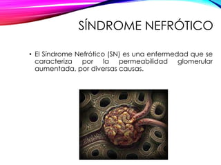 El documento describe el síndrome nefrótico, una enfermedad renal caracterizada por la filtración excesiva de proteínas en la orina. Se presenta principalmente en niños y causa edemas, hipoalbuminemia e hipercolesterolemia. El tratamiento inicial consiste en corticoides orales, aunque algunos casos requieren medicamentos inmunosupresores o diálisis.