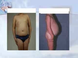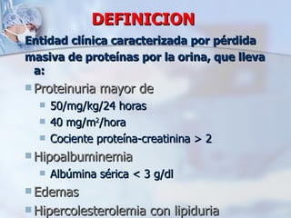 El documento describe el síndrome nefrótico, caracterizado por pérdida masiva de proteínas en la orina. Explica que puede ser primario o secundario a otras enfermedades, y clasifica las lesiones histopatológicas más comunes como cambios mínimos, proliferación mesangial difusa, esclerosis focal y segmentaria, y glomerulonefritis membranoproliferativa. También detalla las complicaciones como infecciones, insuficiencia renal aguda y trombosis, así como las pruebas de diagnóstico y el tratamiento general que