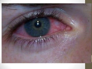 Este documento describe varias afecciones oculares que causan enrojecimiento ocular, incluyendo conjuntivitis, uveítis anterior aguda, glaucoma agudo, queratitis ulcerativa infecciosa, hiposfagmia y epiescleritis. Define cada condición, explica su etiología, patogenia, signos y síntomas clínicos, diagnóstico y tratamiento.
