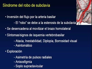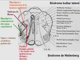 Este documento describe las medidas generales y el tratamiento específico en la fase aguda de un accidente cerebrovascular. Entre las medidas generales se incluyen la protección de la vía aérea, el control de la oxigenación, la tensión arterial y la función cardiaca, así como la prevención de complicaciones. El tratamiento específico incluye la restauración del flujo sanguíneo cerebral a través de antitrombóticos y trombolisis, y la neuroprotección mediante fármacos. Se describen posibles complicaciones neurológicas y sist