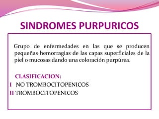 Este documento resume los principales síndromes purpúricos o hemorrágicos. Se dividen en no trombocitopénicos y trombocitopénicos. Dentro de los no trombocitopénicos se encuentran los vasculares congénitos y adquiridos, y los no inflamatorios. Los trombocitopénicos incluyen defectos de producción y aumento de destrucción. Se describe en detalle la púrpura trombocitopénica idiopática, sus criterios diagnósticos,