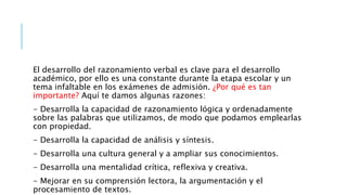 Este documento habla sobre la importancia del desarrollo del razonamiento verbal para el éxito académico. Explica que el razonamiento verbal mejora la capacidad de razonamiento lógico, análisis, síntesis y comprensión lectora. También cubre los sinónimos y antónimos, definidos como palabras con significados similares o opuestos respectivamente, y clasifica los diferentes tipos de sinónimos y antónimos.