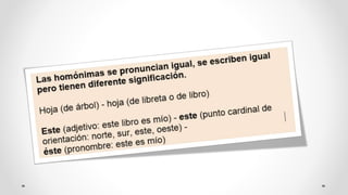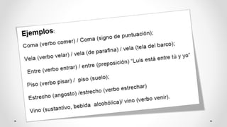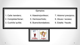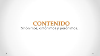 Este documento define y explica los conceptos de sinónimos, antónimos y parónimos. Los sinónimos son palabras de significado similar que pueden usarse para evitar repeticiones. Los antónimos son palabras que expresan ideas opuestas. Los parónimos incluyen homónimos, que comparten forma pero no significado, y homófonos, que comparten sonido pero no forma o significado.