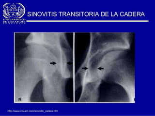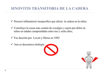 La sinovitis transitoria de la cadera es un proceso inflamatorio inespecífico que afecta la cadera en niños entre 3 y 8 años. Se presenta con cojera y dolor inguinal unilateral que irradia a la rodilla, con limitación de movilidad pero sin afectación general. El diagnóstico se realiza con ecografía y el tratamiento consiste en AINES, reposo y fisioterapia.